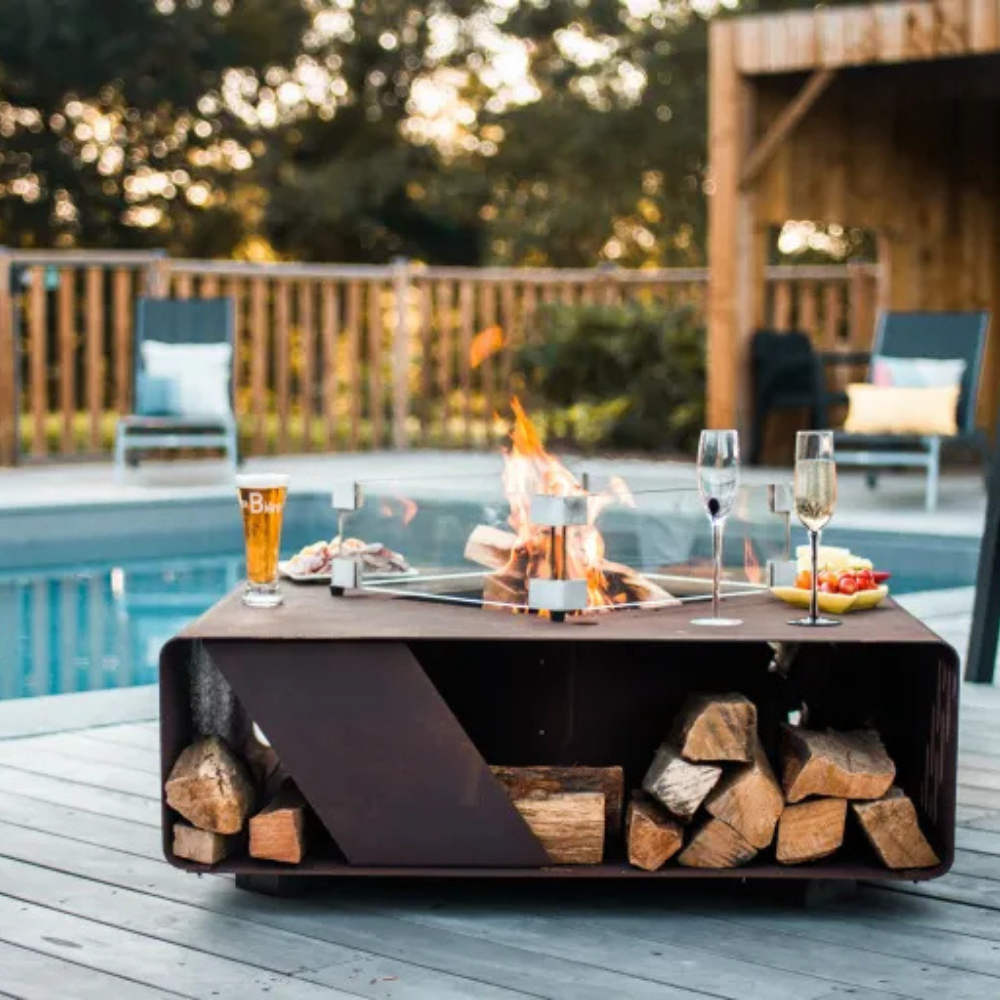 Lareira de exterior a lenha, com função de mesa de centro.